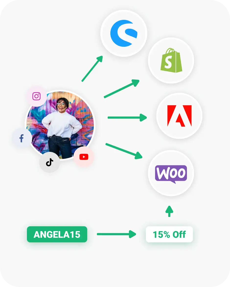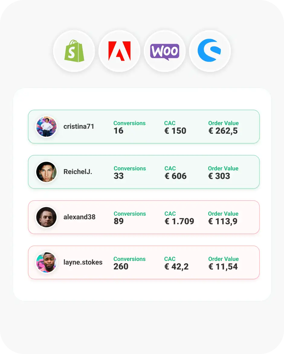 Finally know which creators actually drive sales. Whether you're on Shopify, WooCommerce, Adobe Commerce, or running a custom shop – see conversions, ROAS, and growth in black and white.